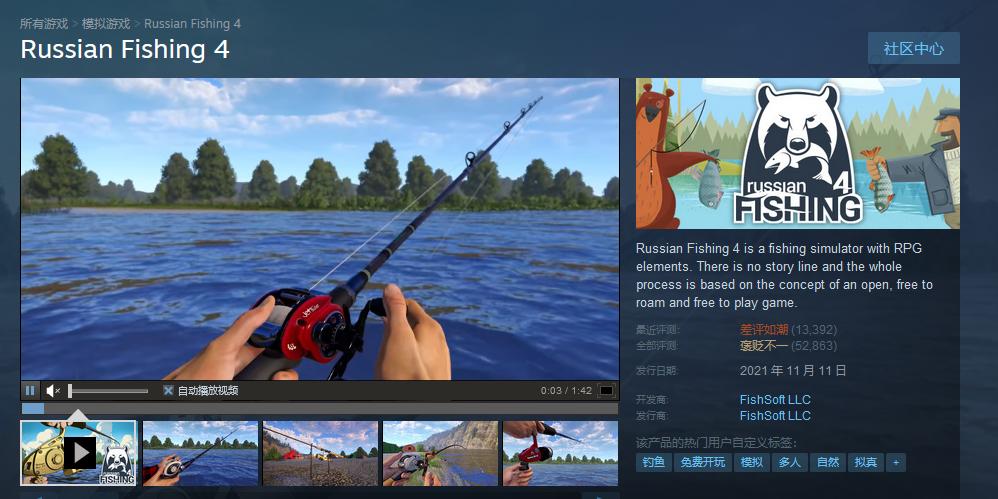 現在打開《俄釣4》Steam商店頁面,最近評測的好評率已逼近岌岌可危的5%,威脅着《三國殺》的歷史地位。截至撰稿前,在短短五天時間內,來自中國的玩家一共給這款遊戲刷了12588條差評。