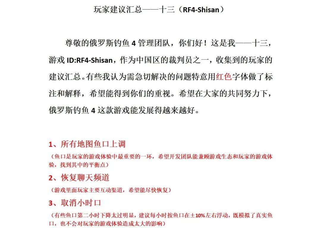 在他的描述裏,受苦本就是釣魚遊戲最大的樂趣之一,所以小時口、商店限量、魚口降低等決定都是遊戲開發總部決定的,跟中國代理沒有關係,並且他們堅決不改,因爲會“降低遊戲質量”。
