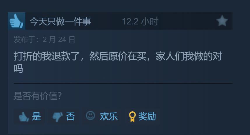 在遊戲結束首發折扣後,有位玩家辦理了退款,重新以全價購買了遊戲。