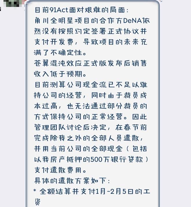 在這張截圖中,發言人表明如今的 91Act 運營狀況舉步維艱,未來充滿不確定性,所以他們決定遣散所有員工,只留製作人“姜磊”(後文用 廠長 代指)一人。