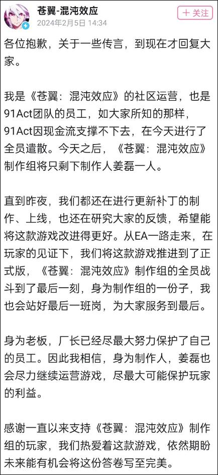 到了第2天(2月5日),91Act 的運營用遊戲官方賬號正式做出回應,確認早前流傳出的聊天記錄屬實,91Act 已經結束了全員遣散,只剩製作人 姜磊(廠長) 一人。