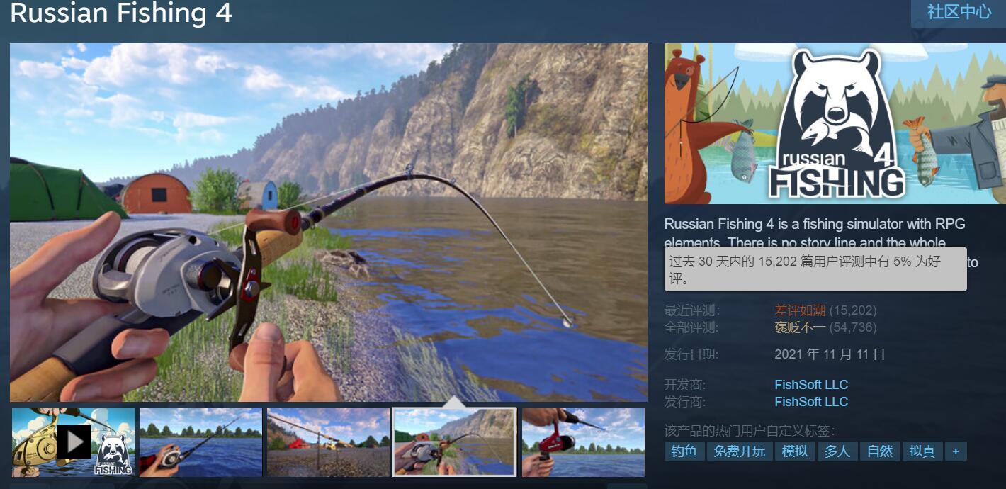 由戰鬥民族FishSoft LLC工作室研發運營的《俄羅斯釣魚4(Russian fishing 4)》,是一款釣魚模擬免費遊戲,因爲硬核的玩法大受歡迎,國內也有無數釣魚愛好者對這遊戲愛不釋手,但是近日遊戲據遭到了大量國內玩家的差評攻擊,5天時間刷出了一萬多條差評,遊戲口碑從“特別好評”變成近期“差評如潮”,好評僅有5%,直接威脅到了《三國殺》的王者地位。