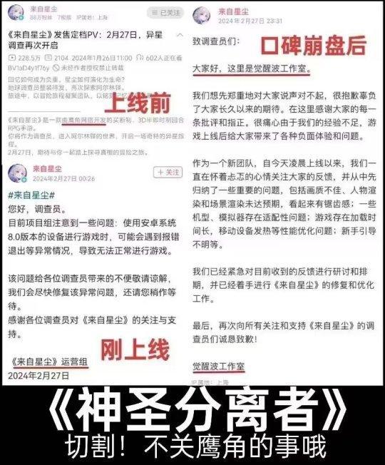 而在被差評轟炸後,玩家們發現,鷹角竟與遊戲進行光速切割,官方號的後綴署名從鷹角、《來自星塵》運營組變成了覺醒波工作室,鍋反正是分好了。