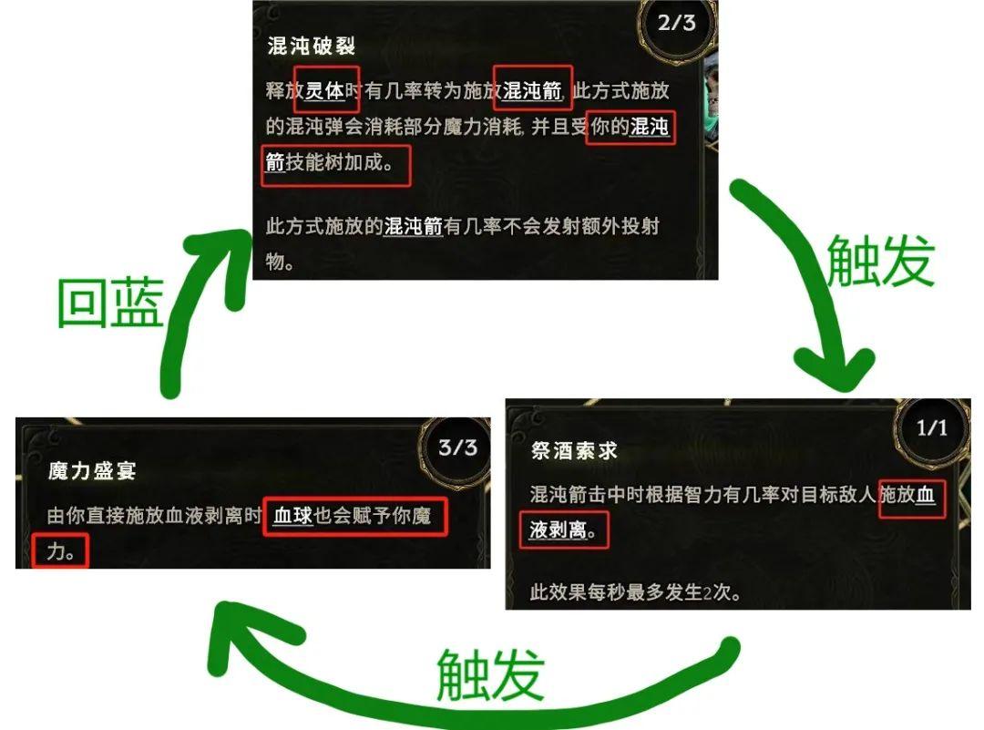 同時,這些技能樹加點,可以互相套娃、形成連招。比如我身邊一個玩術士職業的朋友,發現混沌破裂某個分支有幾率施放混沌箭,混沌箭某分支又有幾率施放血液剝離……本來這樣加點技能樹,藍是不夠用的,但血液剝離分支裏有回藍設計,又把這個缺陷給補足了,形成閉環。