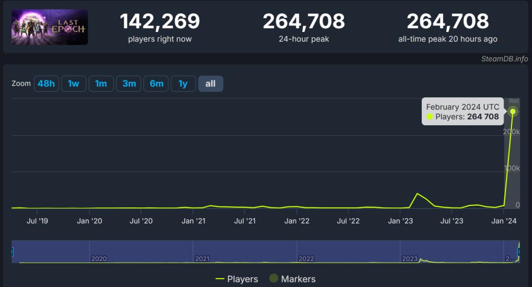 玩家人數暴漲,這大概是能讓所有廠商在夢裏笑醒的場面。但對於2月22日從EA轉爲正式版的類暗黑獨遊《Last Epoch(最後紀元)》來說,這潑天而來的富貴,卻沒那麼好接住——他們的服務器被擠爆了。