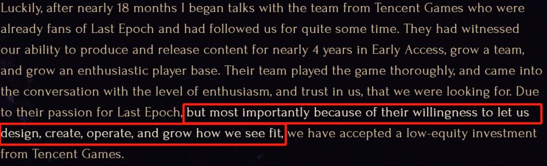 可能有人會不認同我的想法,因爲EHG後來向大廠借了把手——騰訊TGIF(Tencent Gameplay Innovation Fund)計劃關注到了《Last Epoch》,後來主動聯繫EHG,並大約在2021年左右完成了對該工作室的投資。