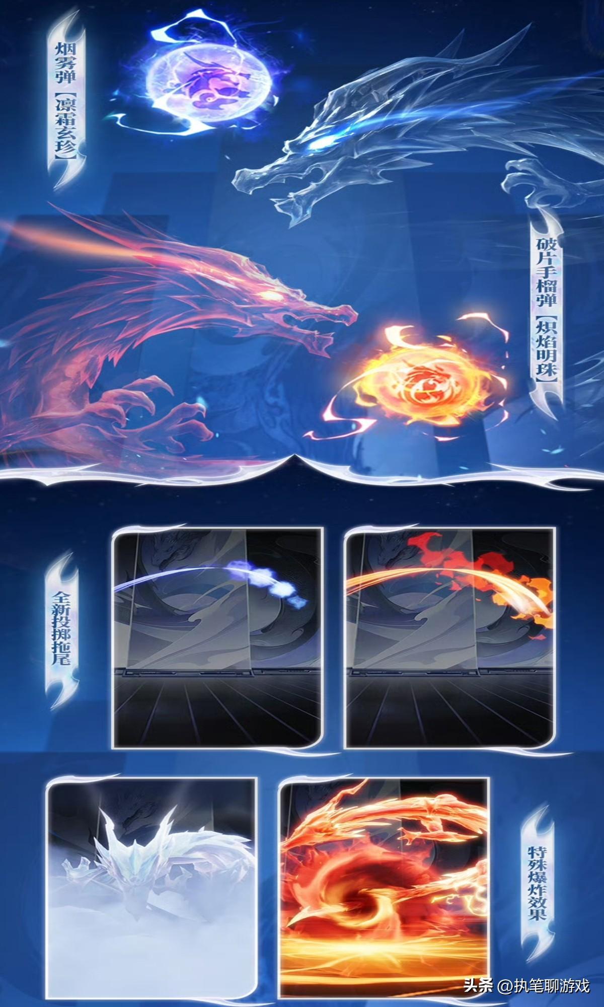 而“隔壁”裏的投擲物皮膚,不僅出現了使用效果特效,而且還出現了投擲拖尾。其中的使用效果,以煙霧彈爲例,煙霧出現冰龍;以碎片手雷爲例,爆炸瞬間出現火龍;投擲拖尾則是拋出去後出現的標記。