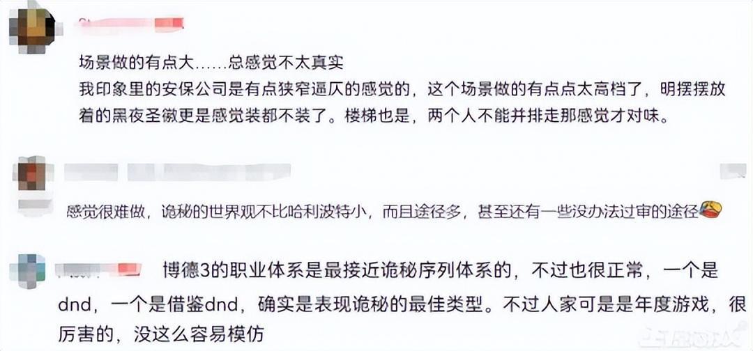 還有網友表示場景做的不真實,小說裏的作爲掩飾身份的保安公司是狹窄逼仄的,沒有這麼高檔,而且還把黑夜聖徽都擺了出來,裝都不裝了。還有對遊戲改編難度感到擔憂的網友表示,《詭祕之主》比《哈利波特》世界觀要龐大得多,而且衆多途徑裏一些途徑可能沒法過審。有網友則表示,《博德之門3》職業體系是最接近《詭祕之主》途徑的設定,不過人家是年度遊戲沒那麼容易模仿。