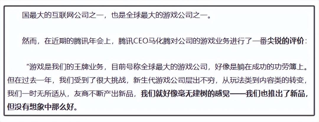 前陣子的年會上,小馬哥就跟手下攤牌了。雖然騰訊號稱全球最大的遊戲公司,但現在卻只會躺在功勞簿上,看着外面新品不斷,自己卻毫無建樹。