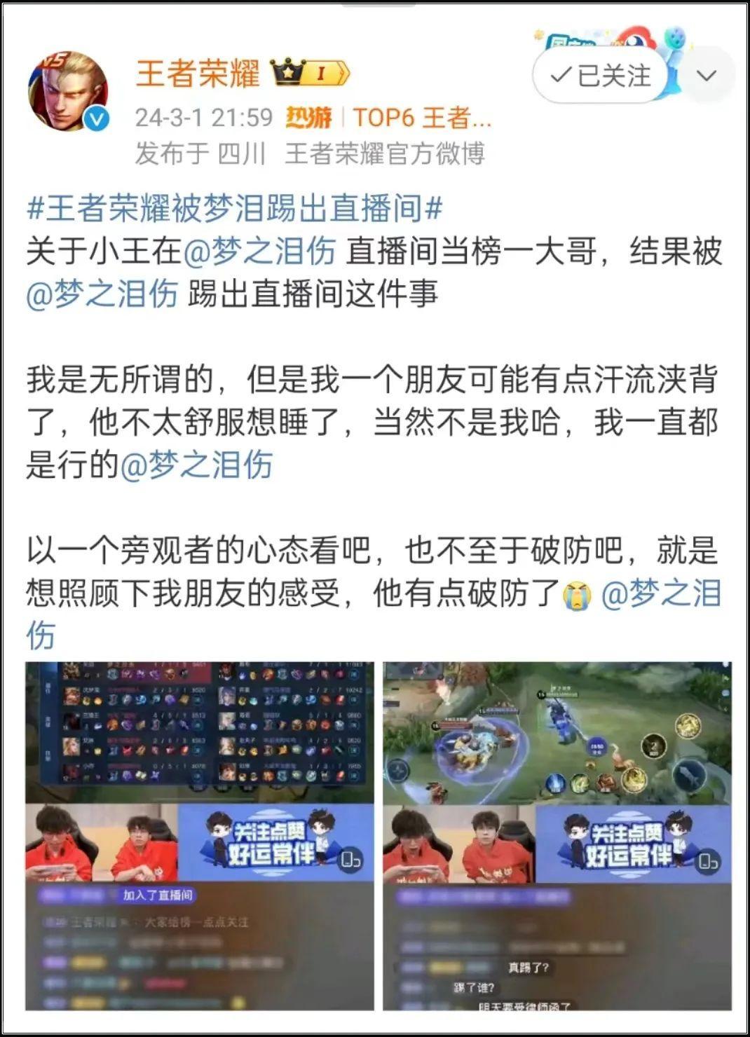 夢淚和林甲楠在一場變身大作戰遊戲中打上了頭,隨着觀衆的一條“把榜一踢出直播間”的彈幕,將“王者榮耀”踢出了直播間。