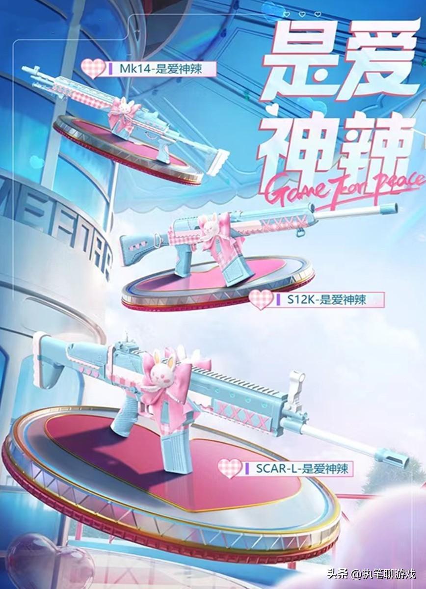首先我們來看3個槍皮,它們分別是MK14、S12K、ScarL,3個槍皮雖然僅是紫色等級,但是均爲光子重新建模,以藍色爲主、粉紅爲輔的顏色搭配,細節裝飾出現了可愛的小兔子頭像。當然,還有最常見的裝飾“蝴蝶結”,似乎離開了它,光子不會做皮膚似的。
