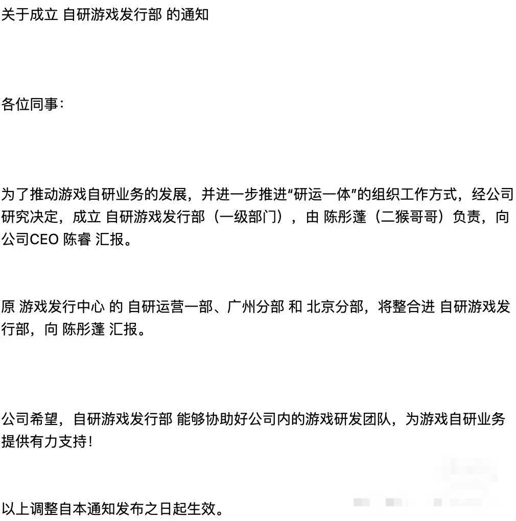 據瞭解,B站遊戲在3月5日發佈內部郵件,稱“爲了推動遊戲自研業務的發展”成立“自研遊戲發行部(一級部門)”,由陳彤蓬負責,向CEO陳睿彙報。同時,B站原“遊戲發行中心”的自研運營一部、廣州分部、北京分部,將整合進自研遊戲發行部,向陳彤蓬彙報。