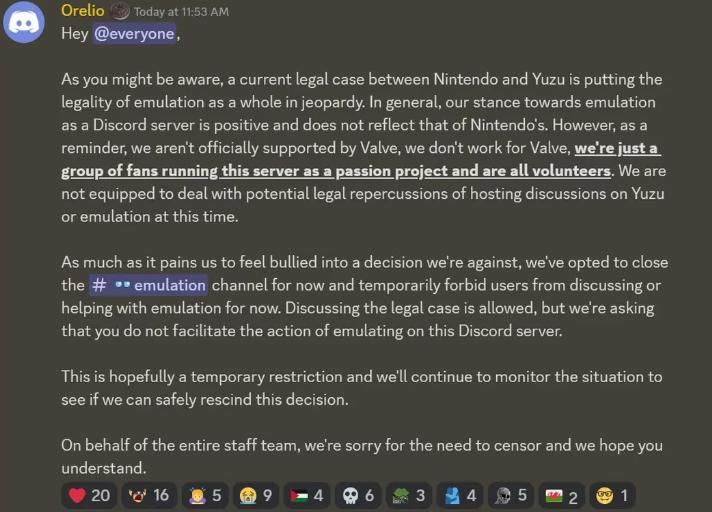 可以說任天堂的這一波來勢洶洶效果斐然,隔壁同爲 Switch模擬器的 Ryujinx 已經關閉了 Discord 邀請,而製作了Steam Deck 模擬器的Orelio 則是澄清自己製作的初衷完全是因爲興趣,沒有盈利的想法,自忖如果V社來打官司根本無法應付,所以也將停止運作。