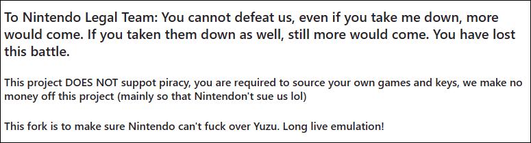 Suyu 在 Github 上給任天堂留了這麼一段叫囂: