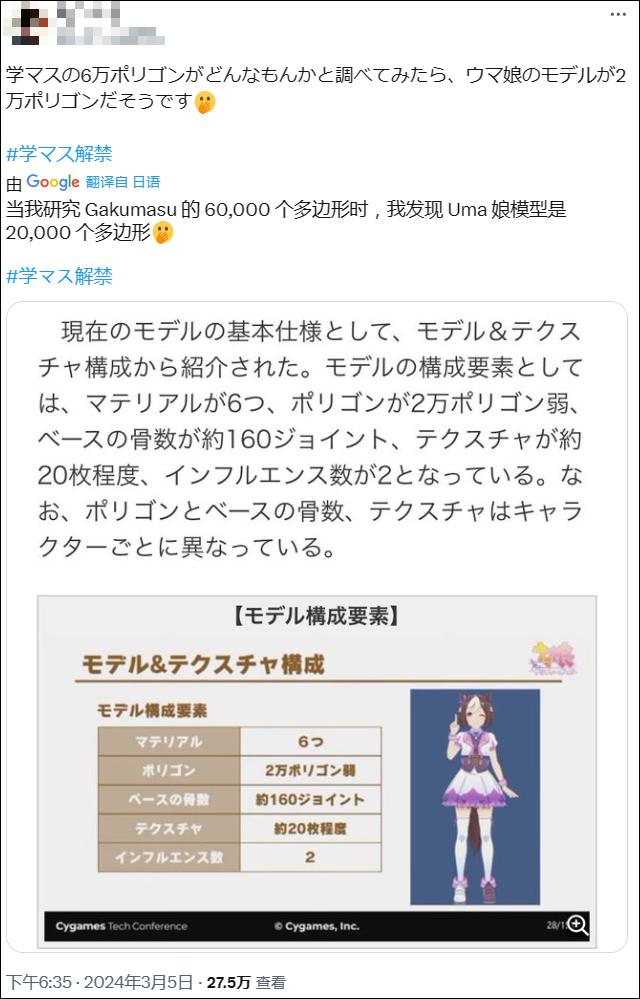 “面數”是普通路人玩家判斷角色建模精度的簡單標準。早前《偶像大師百萬》的角色約有1萬多面,《賽馬娘 Pretty Derby》的馬娘約有2萬面……