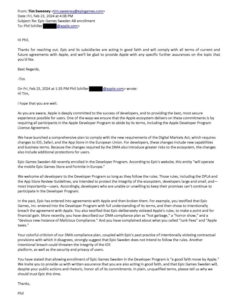 席勒在郵件中寫道:“你激烈批評我們合規計劃,以及Epic以前故意違反合同條款的做法都表明,Epic瑞典分公司並不打算遵守規則。當然你說過,我們允許Epic分公司賬號加入開發者計劃是‘蘋果釋放善意的舉動’。我們邀請你向我們提供書面保證,保證你們也是真誠的,並且雖然你在公開場合的行爲和言論令人不安,但Epic瑞典分公司將會履行其全部承諾。簡單來說,請你告訴我們,爲什麼這次我們應該信任Epic。”
