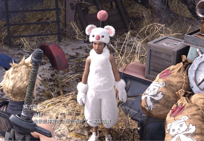 FF7RE中的莫古利,是一位穿着玩偶服的小孩,他因爲崇拜莫古利,就將自己打扮成了它們的樣子,並告訴你可以在他的莫古利商店中兌換道具。