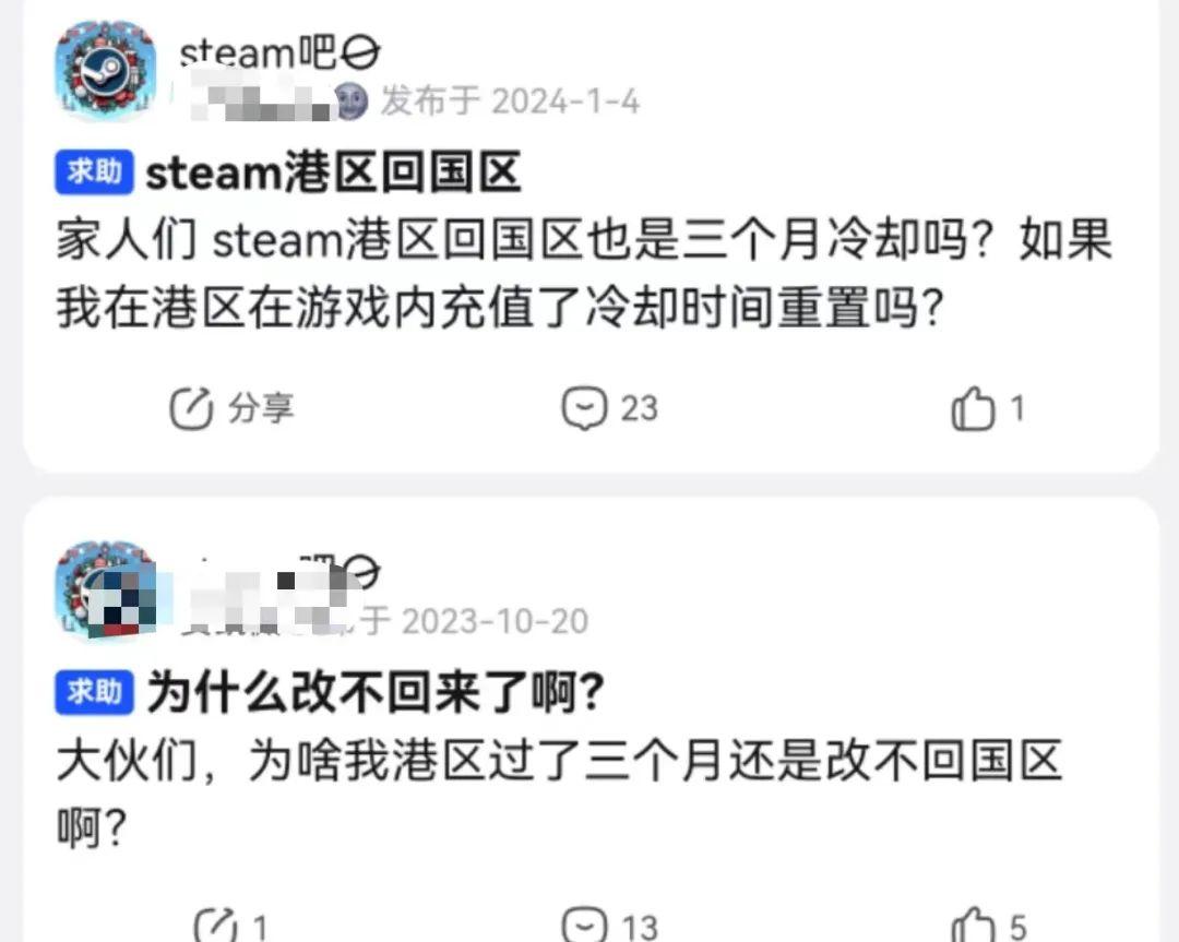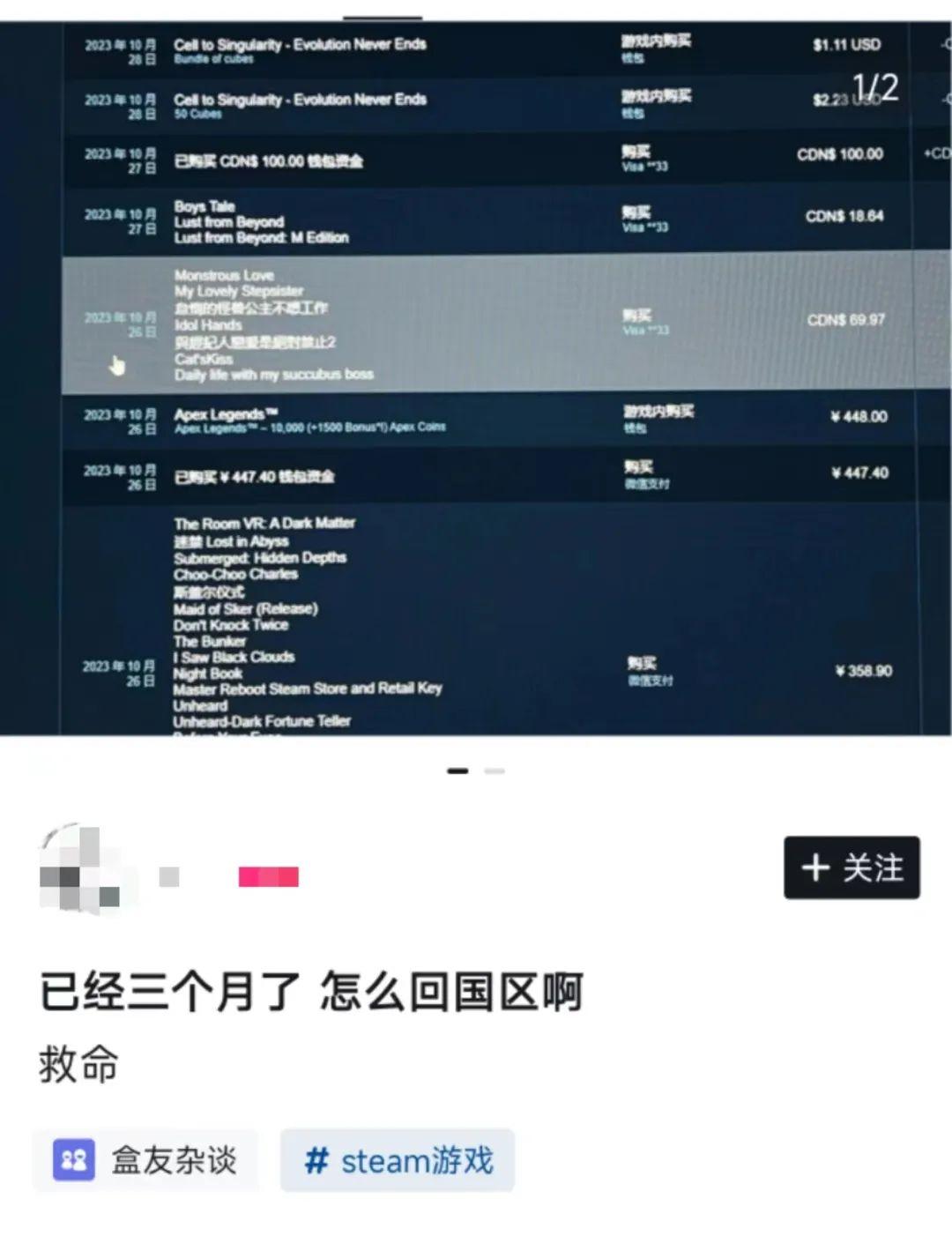 幾天前,幾名玩家在小黑盒APP吐槽到,自己三個月前“不慎”用港幣進行了消費,導致賬號被綁架去了香港。按照Steam的轉區限制,理論上三月之期已到,玩家就可以再次進行轉區了。
