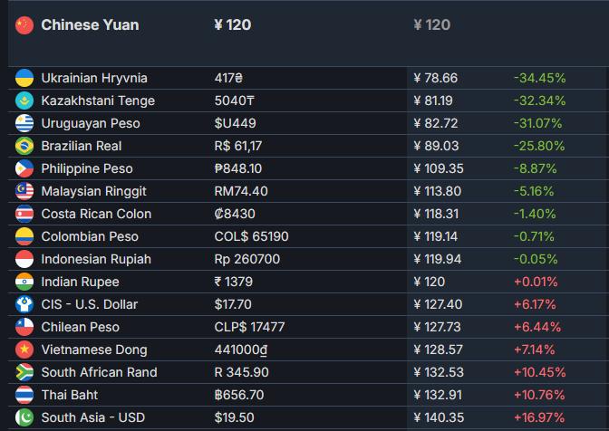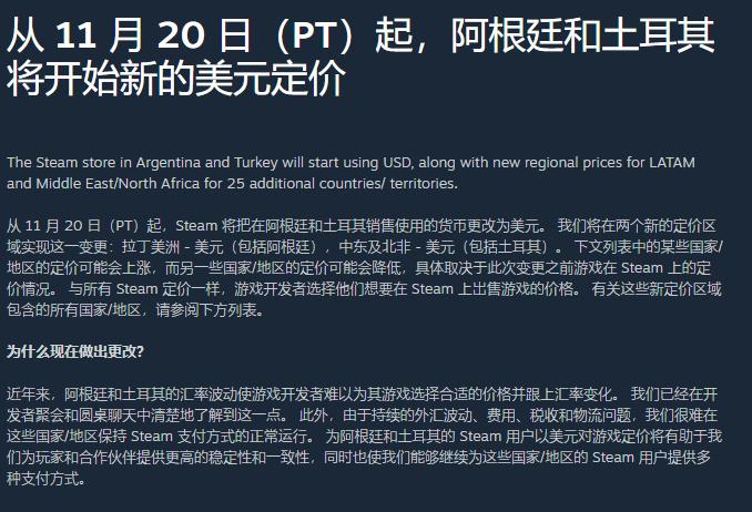 或許有玩家會將這一賽博返鄉潮歸結於去年年底Steam推出的新政策:從 11月 20 日起,在阿根廷和土耳其銷售使用的貨幣更改爲美元進行結算。