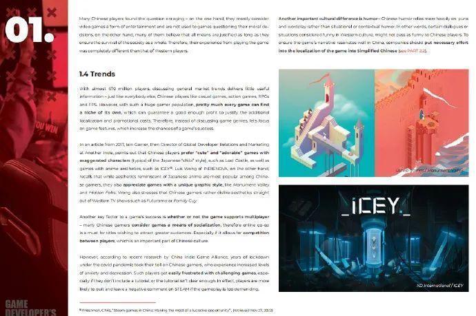 比如說,“中國遊戲市場龐大,每款遊戲都有合適的受衆。不要擔心遊戲類型,而要關注遊戲本身”,以及“中國玩家認爲遊戲是一種社交手段,因此在線合作對於希望吸引更多受衆的遊戲是必須的”。