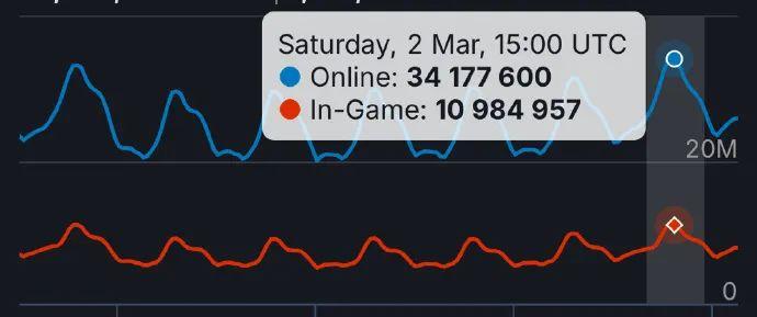 這個新聞的背後還夾雜着一條不那麼惹路人注意的小新聞,在同一天裏,Steam 同時在線人數突破了3400萬,也創下歷史新高。