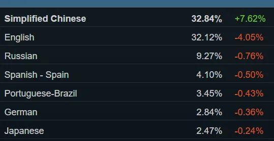 三天前,一條標題爲#簡體中文成爲Steam最常用語言#的新聞衝上了國內的熱搜。根據最新的Steam平臺2月軟硬件調查數據顯示,簡體中文(Simplified Chinese)已經以32.84%的佔比超越了英文,已經成爲該平臺最常用的語言。