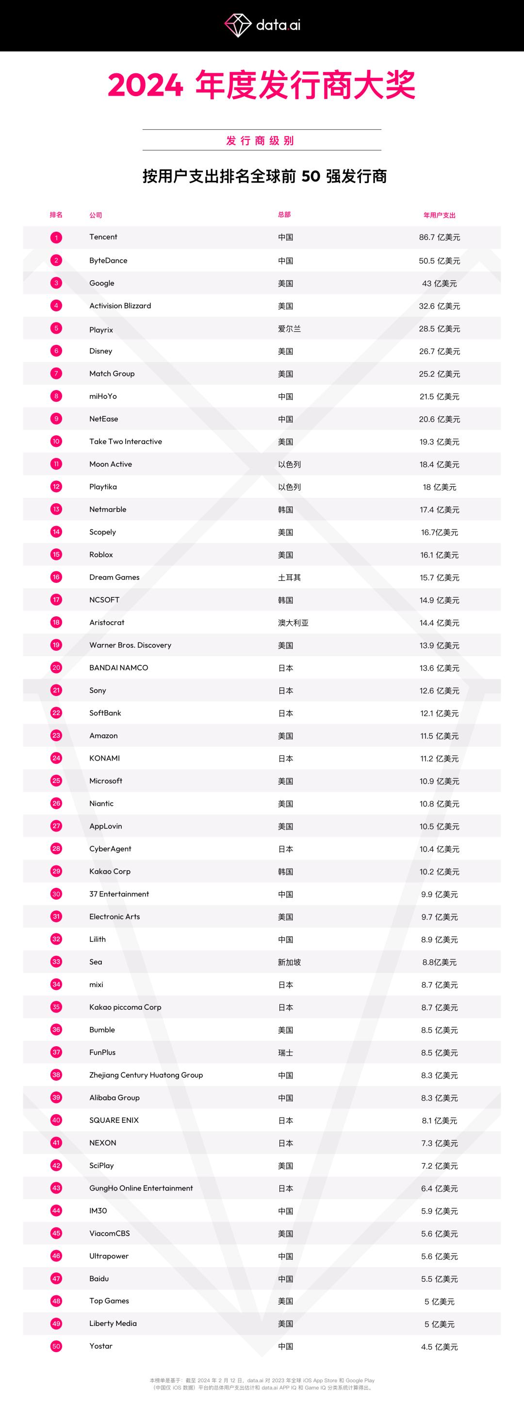 data.ai基於2023年移動市場營收表現總結排名前50的全球發行商和公司。