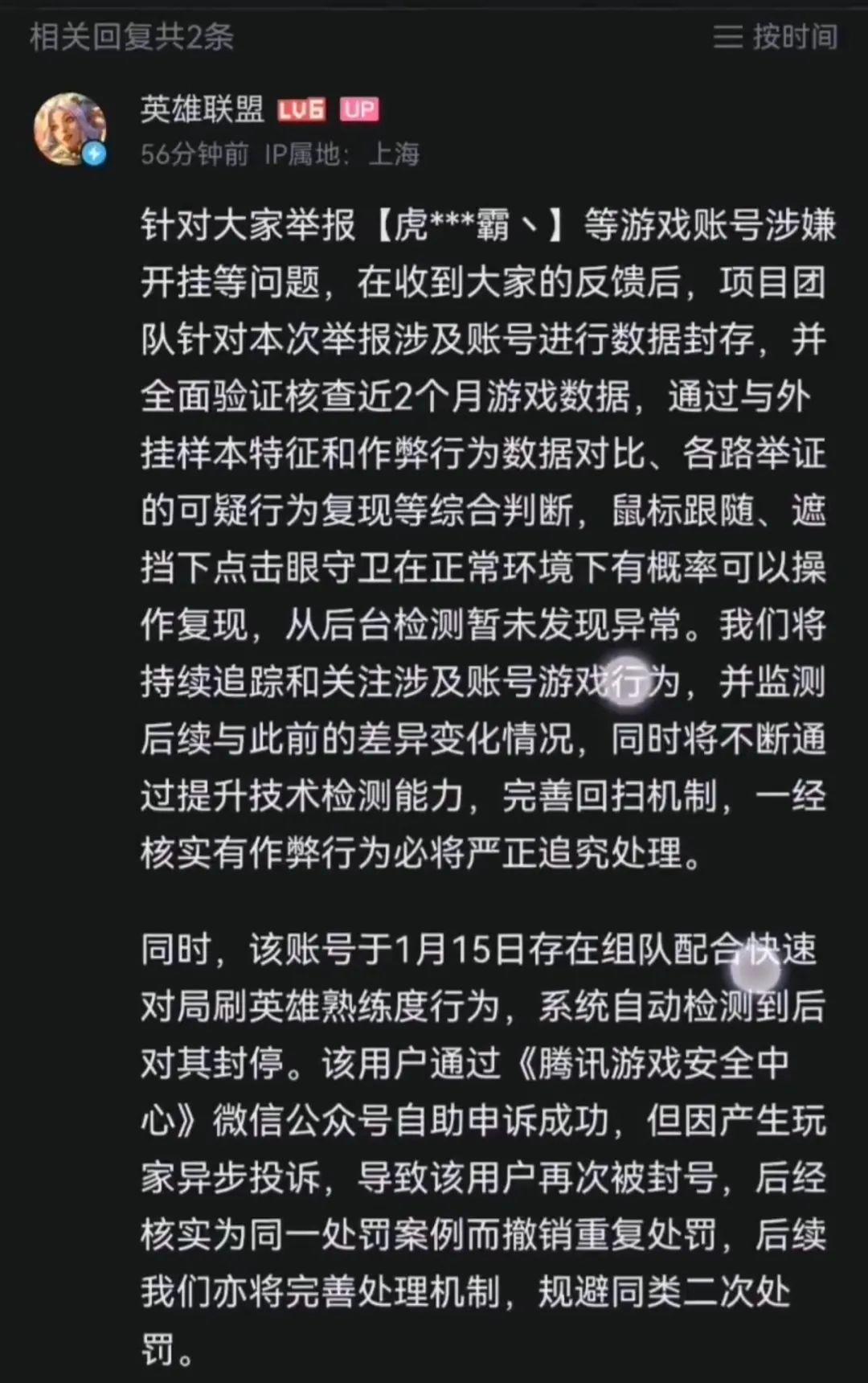 並表示,1月15日存在組隊配合快速對局刷英雄熟練度行爲,系統自動檢測後對其封停,自助申訴成功過,後續撤銷了二次處罰。