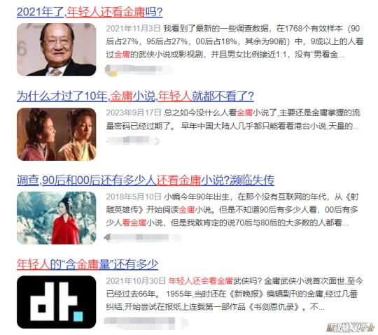 近些年,關於“年輕人誰還看金庸”似乎成爲了經久不息的話題,像X博士的一個00後同事就表示他只看過一丁點相關電視劇,與X博士小時候成天泡在金庸筆下的江湖夢裏截然不同。