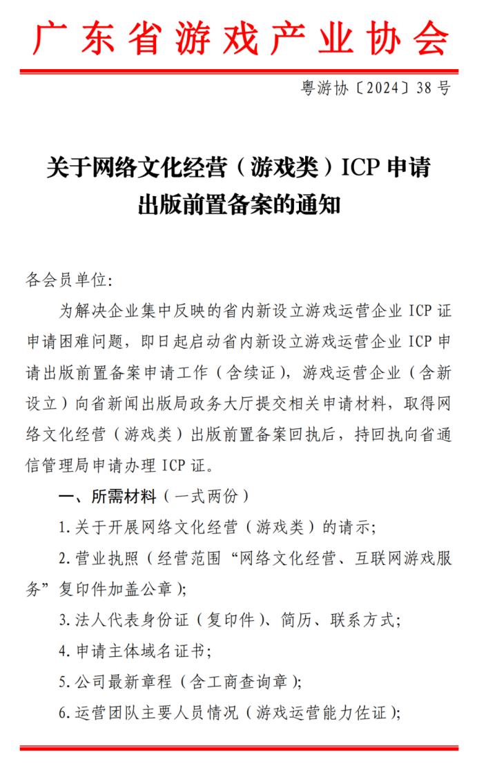3月5日,廣東省遊戲產業協會發布通知,爲解決企業集中反映的省內新設立遊戲運營企業ICP證申請困難問題,即日起啓動省內新設立遊戲運營企業ICP申請出版前置備案申請工作(含續證),遊戲運營企業(含新設立)向省新聞出版局政務大廳提交相關申請材料,取得網絡文化經營(遊戲類)出版前置備案回執後,持回執向省通信管理局申請辦理ICP證。