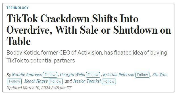 今日,據《華爾街日報》報道說,前動視暴雪CEO鮑勃·考迪克正在考慮收購TikTok,因爲美國衆議院又要就“要求在美國出售或禁止TikTok”的立法進行投票了。