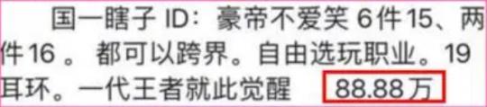 後續,有網友在第三方平臺上看見了騷豪掛的國一瞎子,標價僅售88.88萬。要知道單單是紅19耳環的價格就值75萬,騷豪標的這價格壓根就是清倉大甩賣了,所以旭旭寶寶成了最後的接盤俠,拿下了騷豪的賬號。