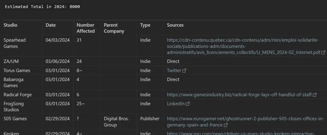 一個持續更新裁員情況的文檔,3月上旬還有廠商在裁員
