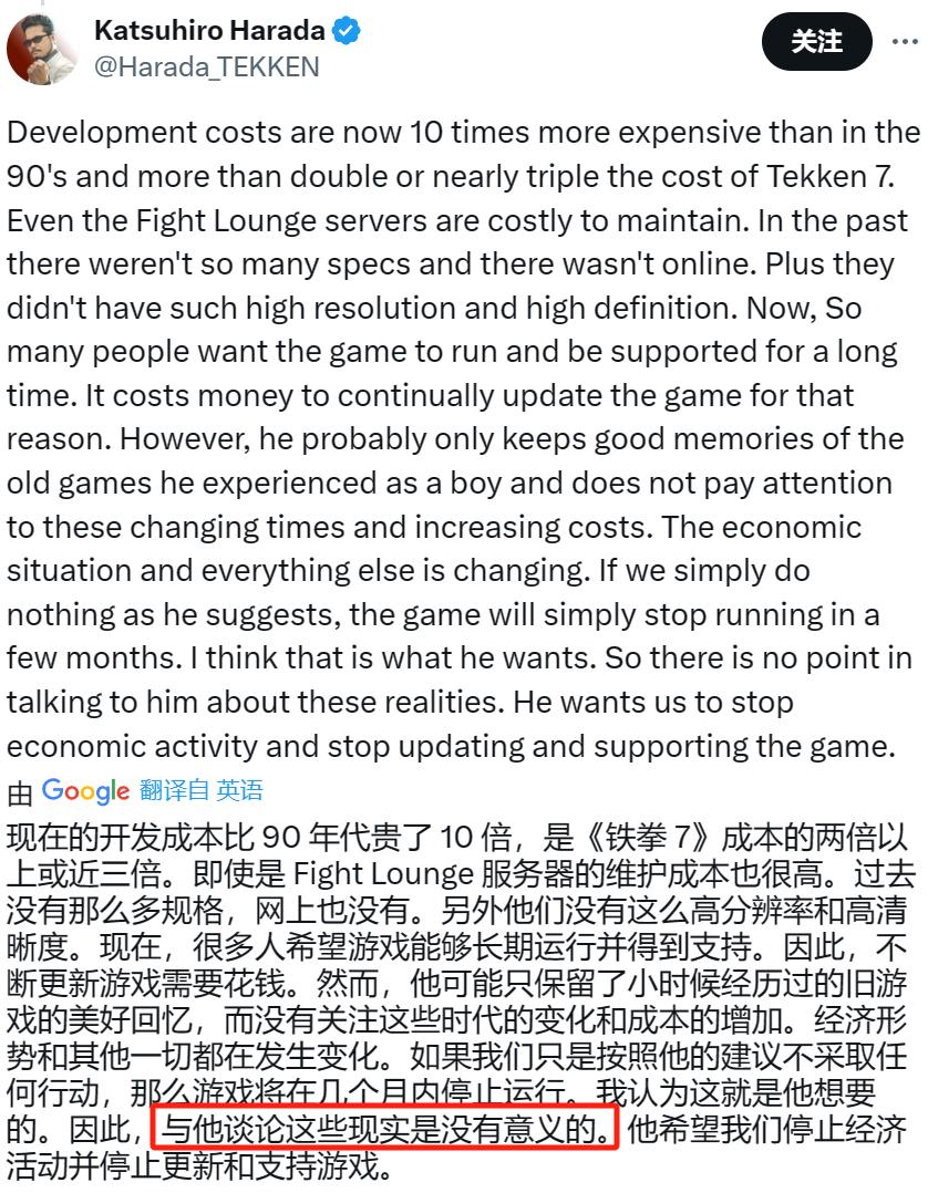 前不久,付費遊戲《鐵拳8》就因爲增置服飾內購,引發了玩家的爭論。《鐵拳》系列總監原田勝弘(Katsuhiro Harada)後來在X上發了一段長文,解釋現在做遊戲、維持運營的成本有多高,如果不做商業化,可能遊戲幾個月內就會死掉……但在長文的結尾,原田勝弘也提到:和玩家解釋這些現實問題,沒有意義。