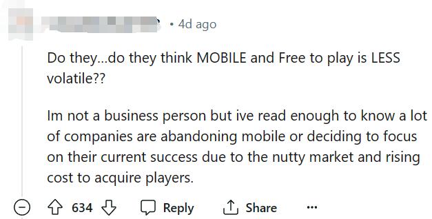 “他們……他們真的認爲F2P手遊市會更穩定??我不是從業者,就連我都知道現在有很多廠商在放棄手遊,或者只聚焦於自己手頭的成功項目,因爲手遊市場現在表現比較糟糕,且做手遊的人工成本在上漲。”