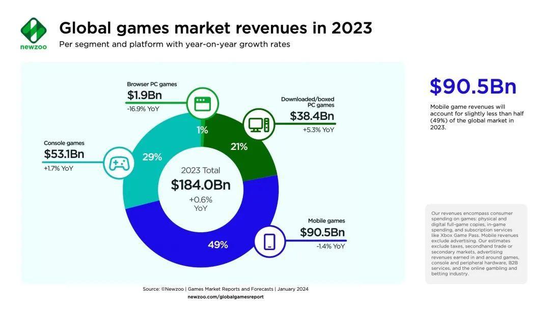 從Newzoo統計的數據來看,確實難——2023年全球遊戲收入爲1840億美元,只比2022年漲了0.6%。