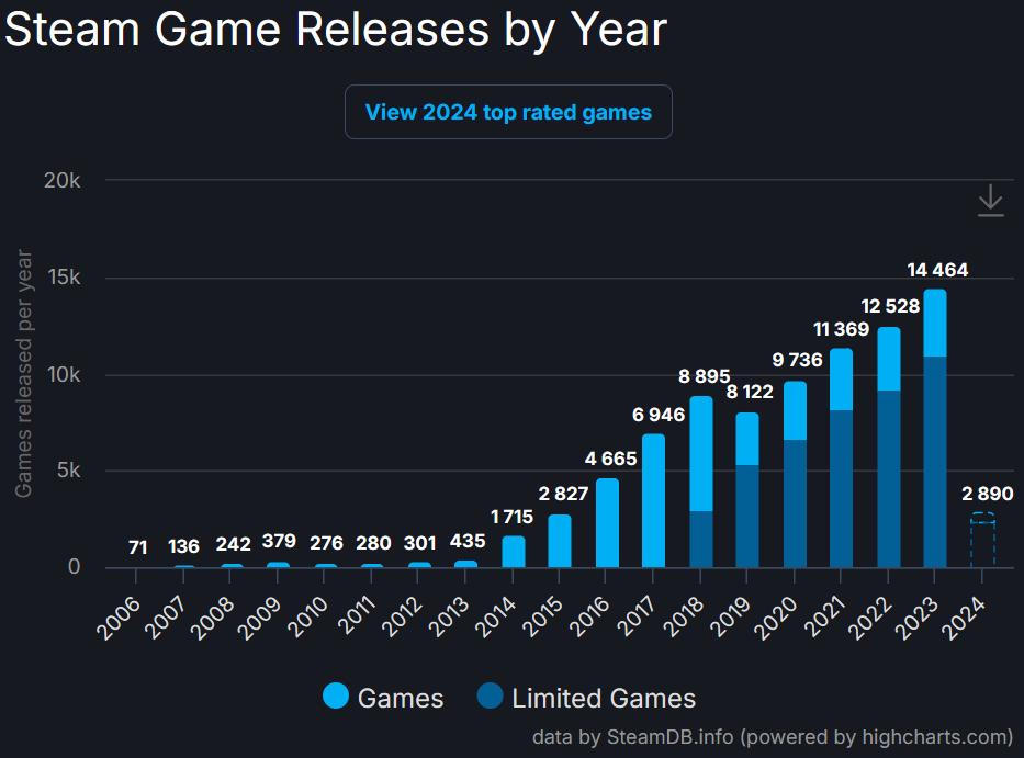 圖源SteamDB:2023年,Steam上架新遊14464款。