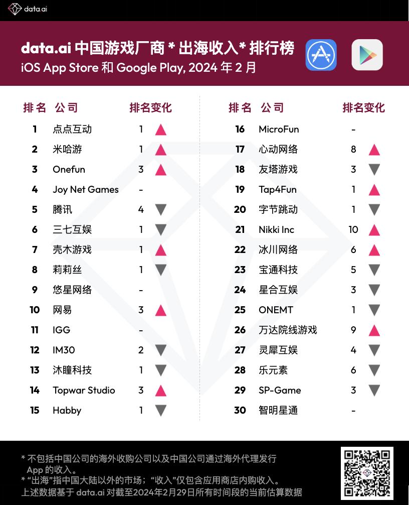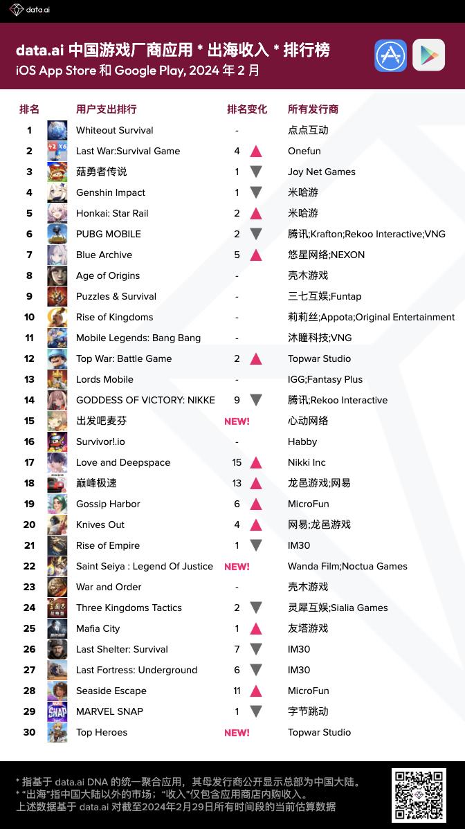 2月廠商出海榜:點點、米哈遊月入過億美元,三匹黑馬殺入TOP 5