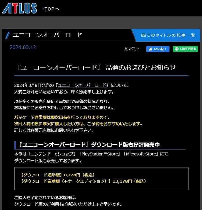 香草社新作《聖獸之王》於3月8日發售,和《十三機兵防衛圈》的叫好不叫座不同,《聖獸之王》的熱度可謂相當火爆,以至於發行商Atlus在今天發佈公告,爲《聖獸之王》實體版因大受好評而缺貨的情況致歉。