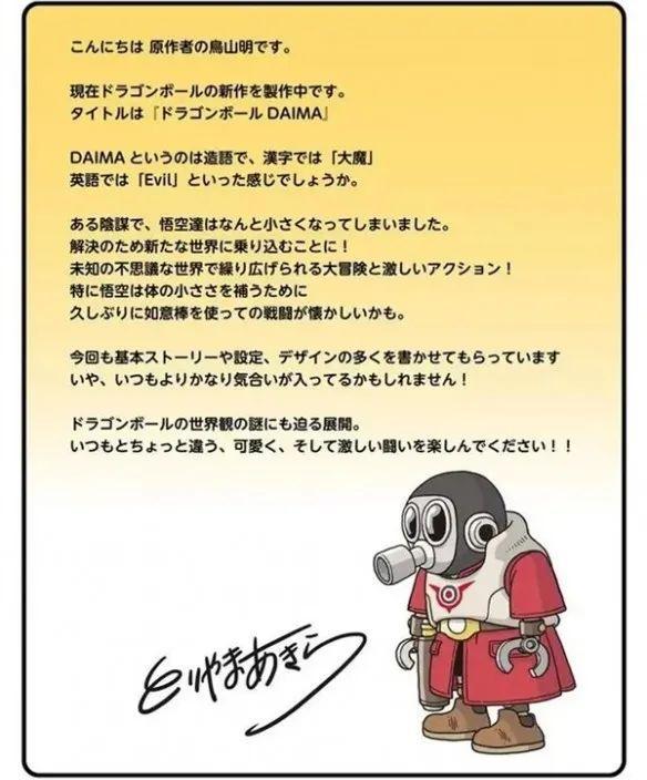 大家好,我是鳥山明,現在正在製作一部《龍珠》新作,標題是《龍珠DAIMA》。DAIMA是造詞,漢字是“大魔”,英語是“Evil”的感覺吧。因爲一個陰謀,悟空他們竟然變小了,爲了解決而進入新的世界。 在未知的不可思議的世界展開的大冒險和激烈動作,特別是悟空,爲了彌補身體的小而久違地使用金箍棒戰鬥,或許令人懷念。這次也讓我寫了很多基本故事、設定、設計,可能比平時更有幹勁! 《龍珠》世界觀的謎團也迫近展開,請享受和平常稍微不同,可愛,而且激烈的戰鬥!