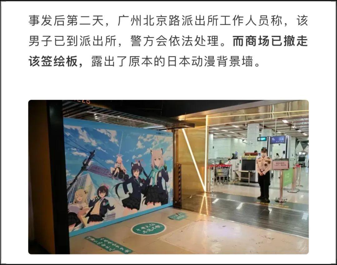 根據後續網絡新聞報道,男子被警察帶到派出所以後,商場工作人員收拾現場,撤走了籤繪板,露出原本的“日本動漫背景牆”。