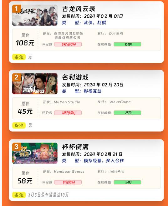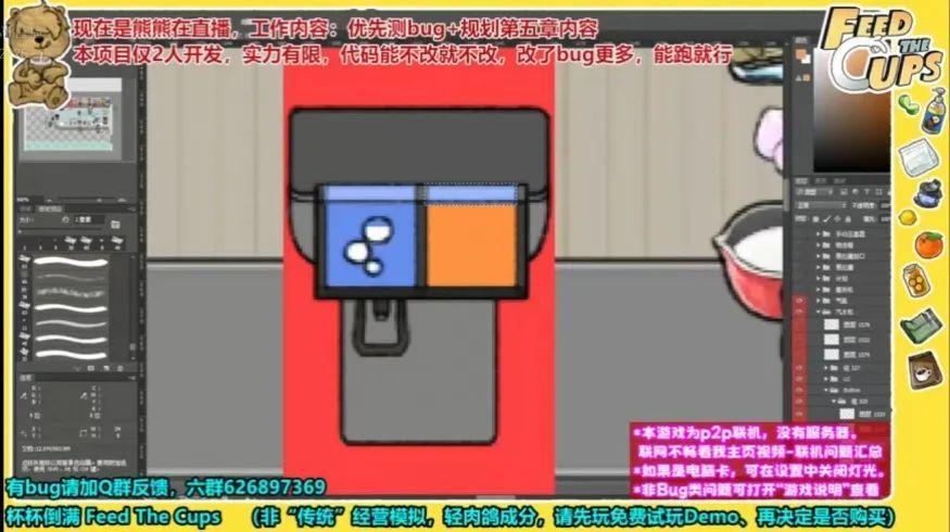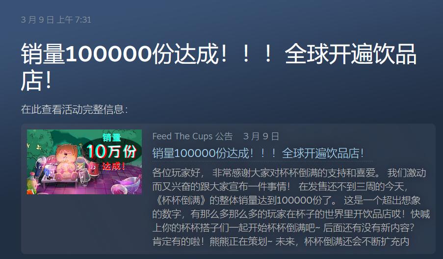 2024年2月21日,由暴走孔明和熊熊兩人開發的獨立遊戲《杯杯倒滿(Feed The cups)》正式發售,並在16天之內就突破10萬銷量。截至撰稿前,該作在Steam已獲得超過93%的好評率。