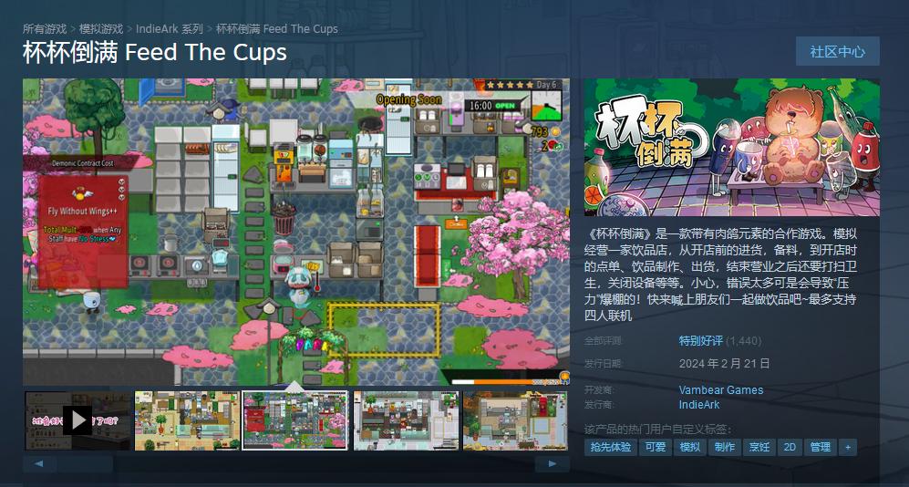 《杯杯倒滿》是一款輕肉鴿模擬經營遊戲,除了單人玩法外,還最多支持4人聯機或本地合作遊玩,聽到這裏,或許你已經不難猜出本作早期的熱度來源——你的下一款《胡鬧廚房》何必要是《胡鬧廚房》?