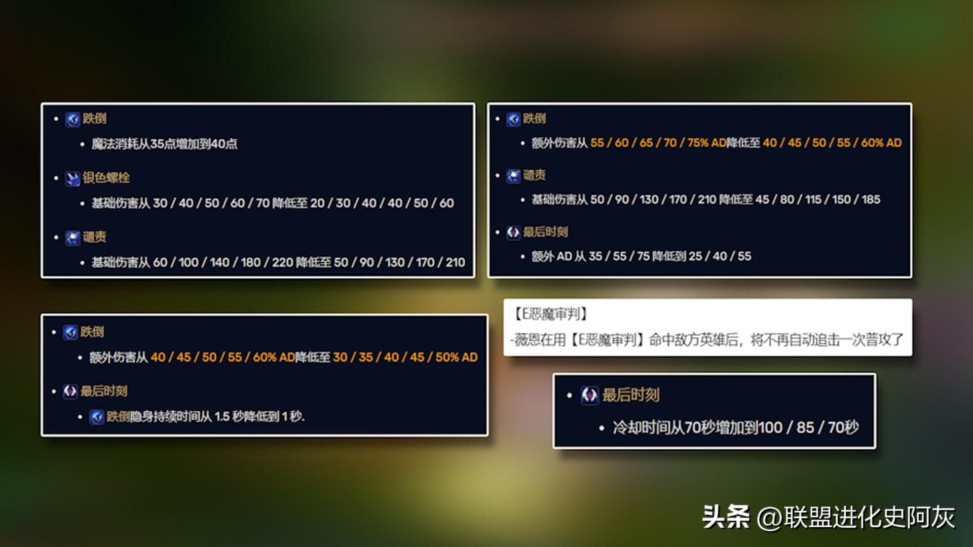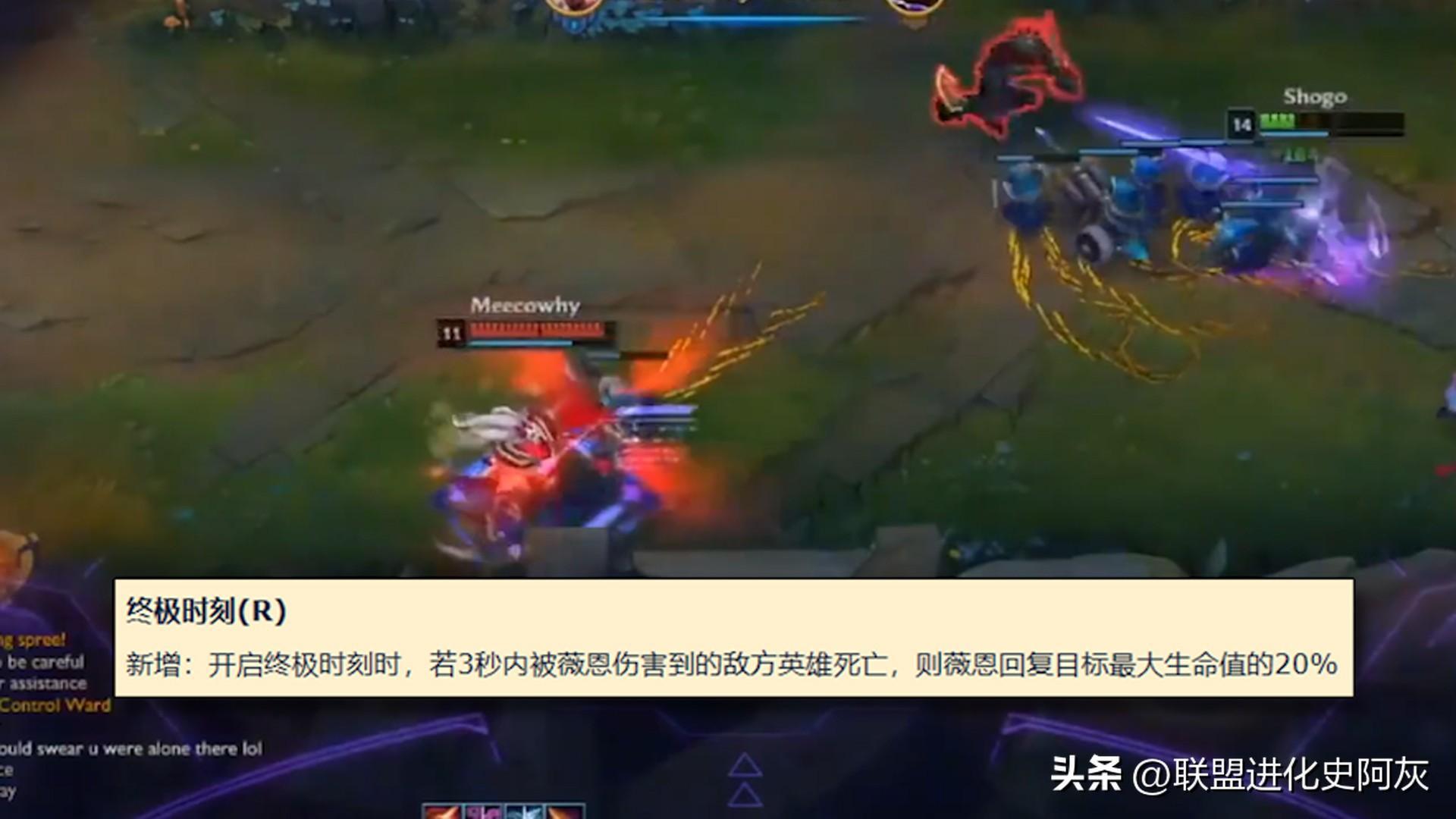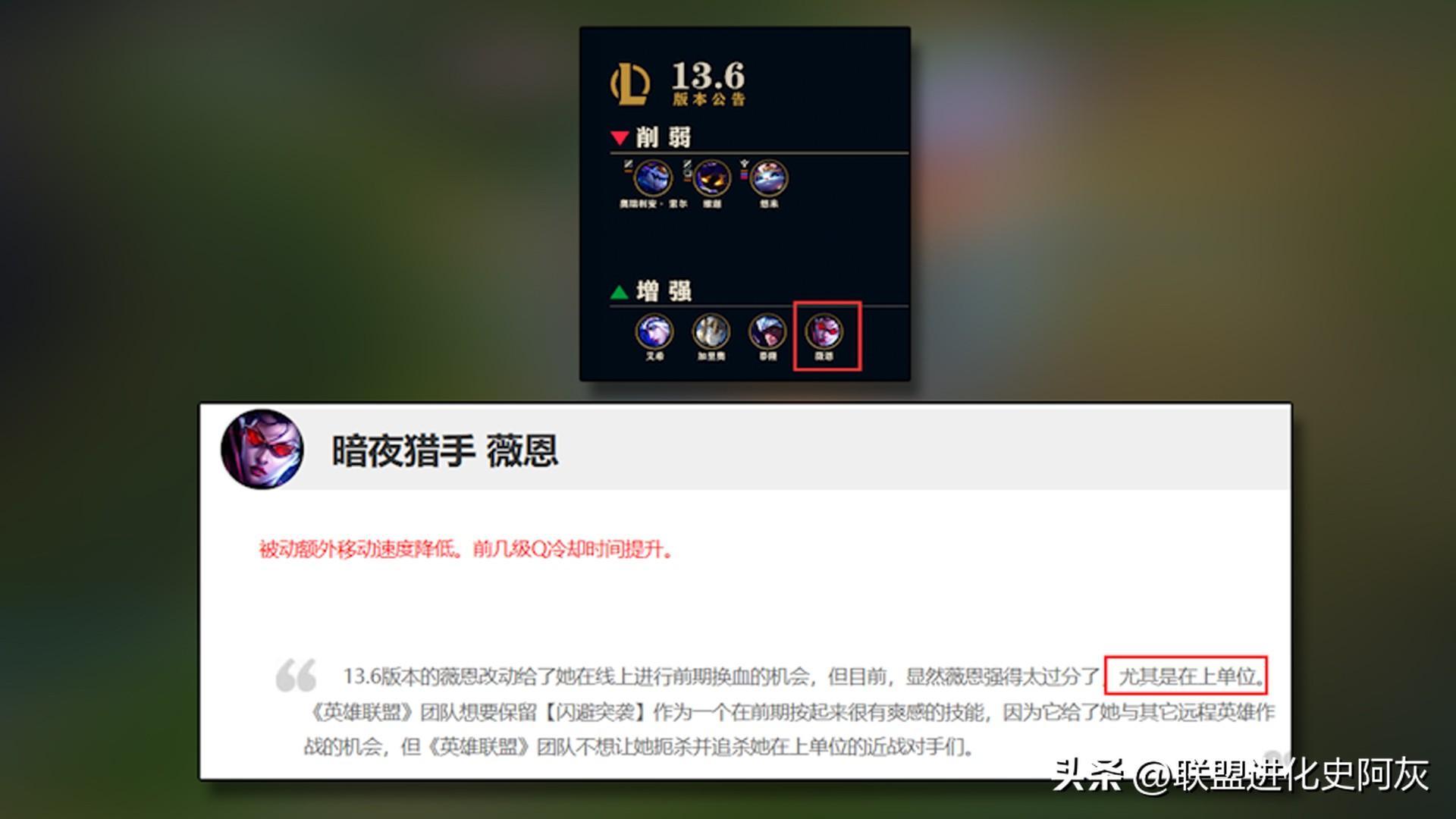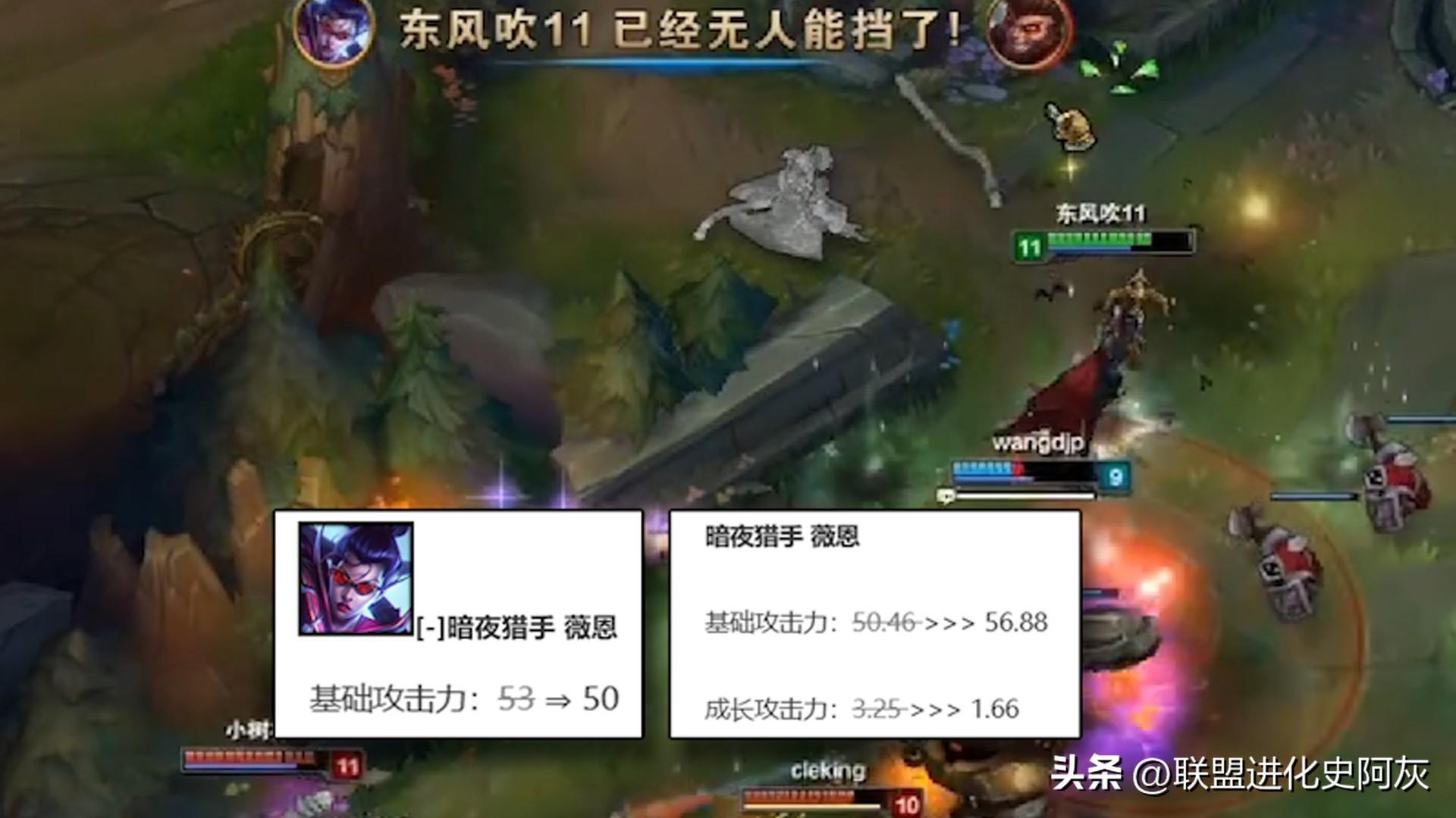 可沒爽多久,就捱了一刀大的,迅捷步伐也倒了,而卡莎的出現成爲了壓死薇恩的最後一根稻草,論後期我不比你弱,論容錯我不比你差,整個一Plus版,導致薇恩的登場率首次跌破了10%,設計師一瞧這可不行,加!狠狠地加!一頓操作下來,薇恩的數值已經來到了,一個非常離譜的程度,結果就出現了名場面:別喫別喫。