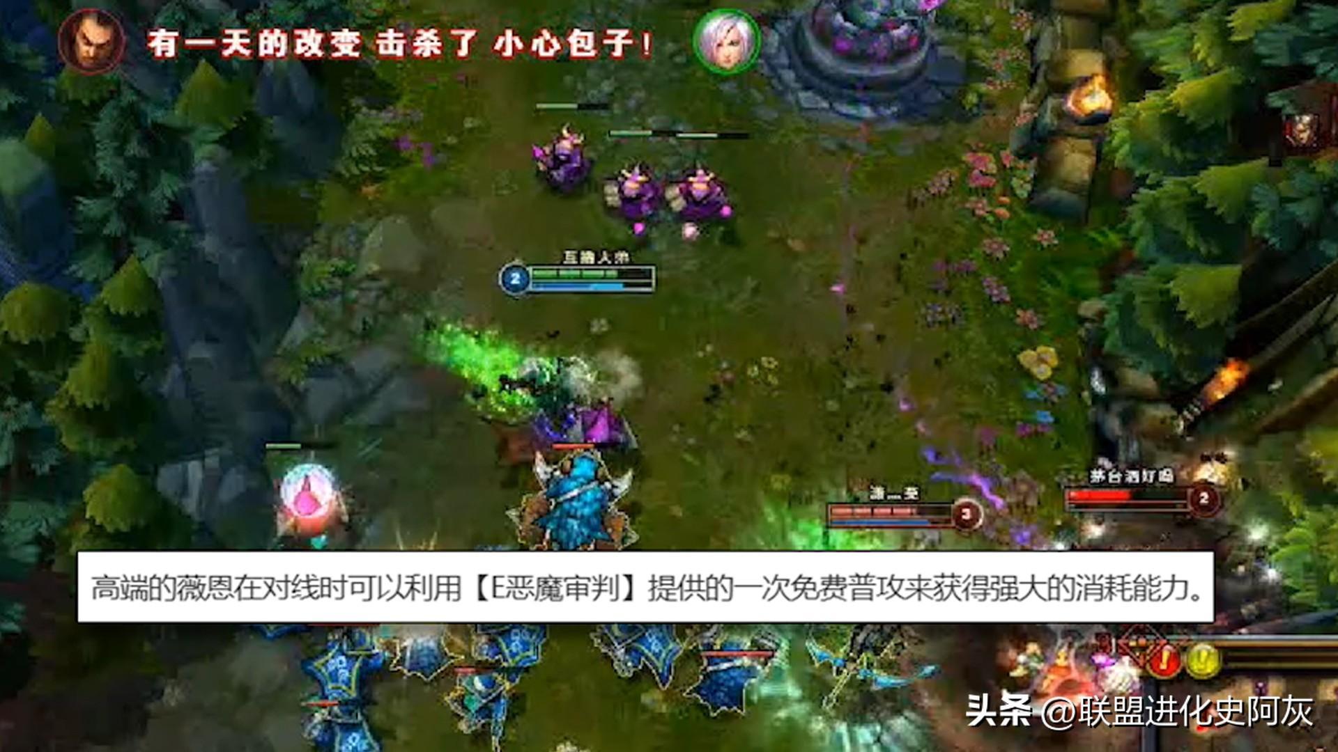 這個時期除了傳統破敗流,還有一種更噁心的玩法,吞噬者打野薇恩,爲啥要說它噁心呢?因爲它不僅折磨對手,也折磨隊友,射手打野懂得都懂,前期默認4V5,可一旦給她刷到30層出山,局勢又會瞬間逆轉,吞噬者薇恩最可怕的地方就是可以無腦補肉裝,後期根本處理不了,結果兩刀攻擊力直擊大動脈,隨着吞噬者的移除,薇恩終於跌落神壇。