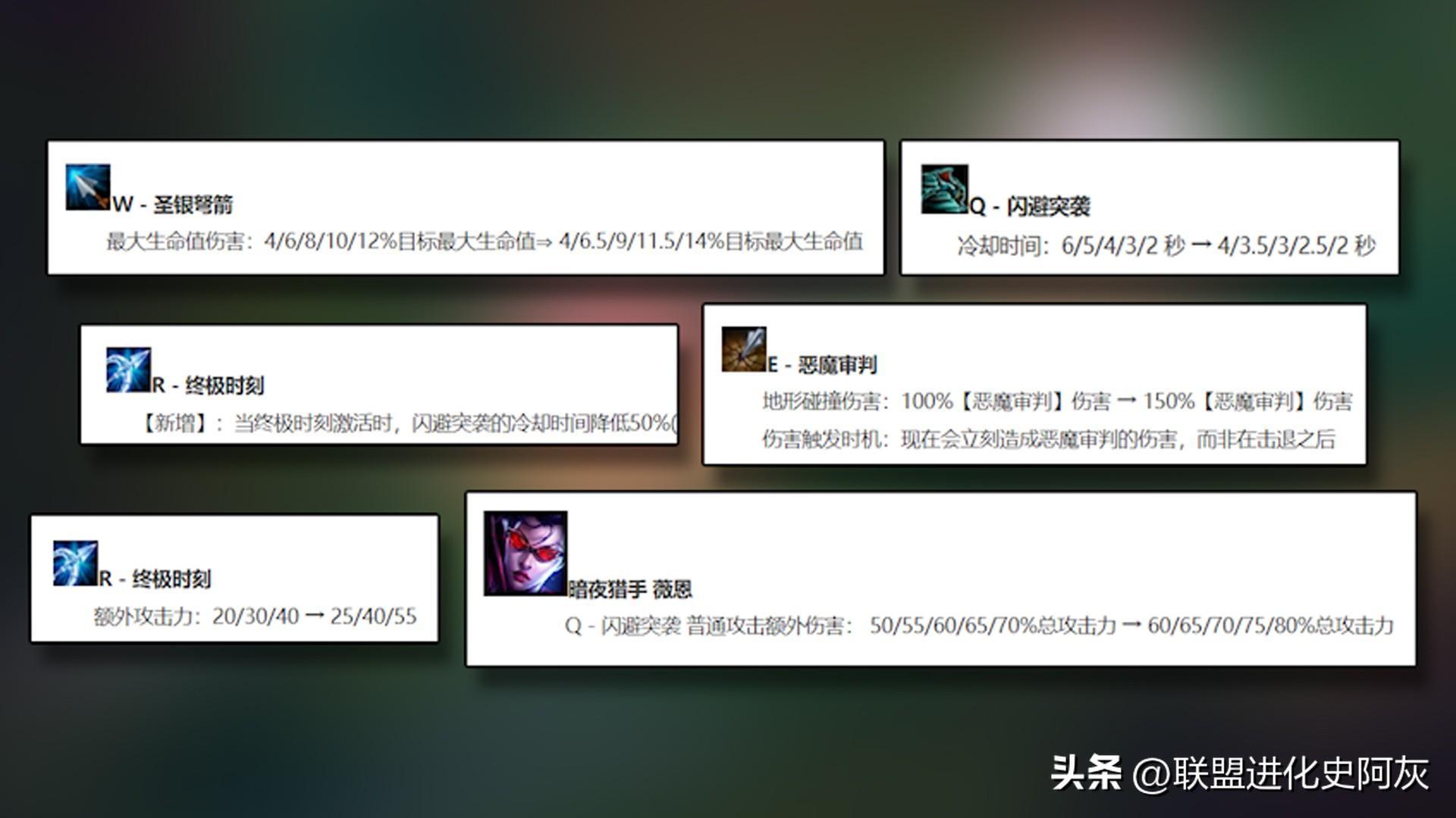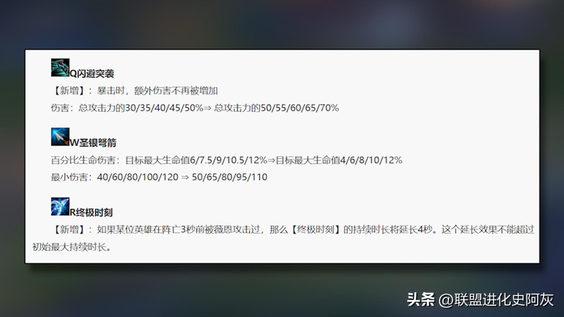 薇恩從11年登錄峽谷至今,技能雖然沒有大變,但機制還是有小變的,就拿Q技能來說,早期可以翻越特定地形,包括皇子大招,理論上這算BUG,可架不住活得久啊(S6才修復),硬是給熬成了機制,W三環能破女妖盾,不像現在對面出個鋒刃只能乾瞪眼。