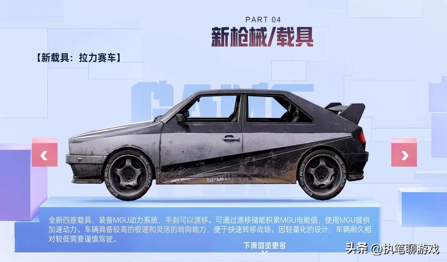 接下來則是新載具,被光子命名爲“拉力賽車”,算是《和平精英》目前唯一裝備MGU動力系統的四座載具,通過“手剎”可以觸發漂移,並且還能通過漂移進行“儲能”,積累MGU電能值用來動力加速,光子稱其具有較高的極速、靈活的轉向能力,唯一的缺點就是耐久較低。