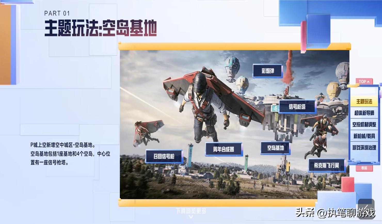 言歸正傳,此次的主題海島當中,P城將會出現一個附在空中的“空島基地”,包括1座基地和4個空島,中心位置還有一座信號槍塔, 具有多種彩蛋以及主題專屬的新道具,例如“希克斯飛行翼”,感覺就像是跳傘之後的飛行器似的,玩法也變得更加多元化。