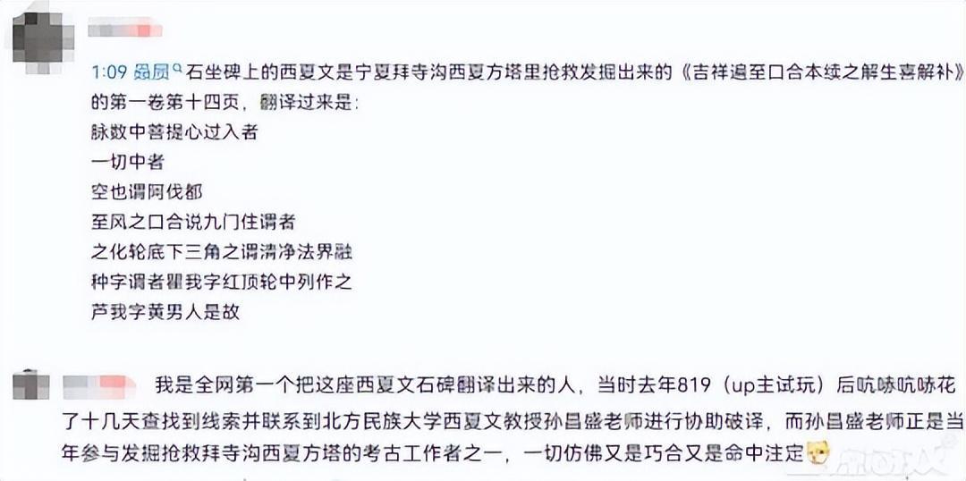 更有硬核網友把視頻裏短暫出現的西夏碑文給翻譯了出來,他還給大家科普說視頻裏出現的西夏碑文是出自寧夏拜寺溝西夏方塔考古活動發現的佛經,因爲此前下線試玩的時候他就注意到這碑文了,後來他就花十多天找資料並聯繫到了北方民族大學研究西夏文的孫昌盛教授幫忙翻譯,而巧合的是孫昌盛教授當年也參與了西夏方塔的考古活動。