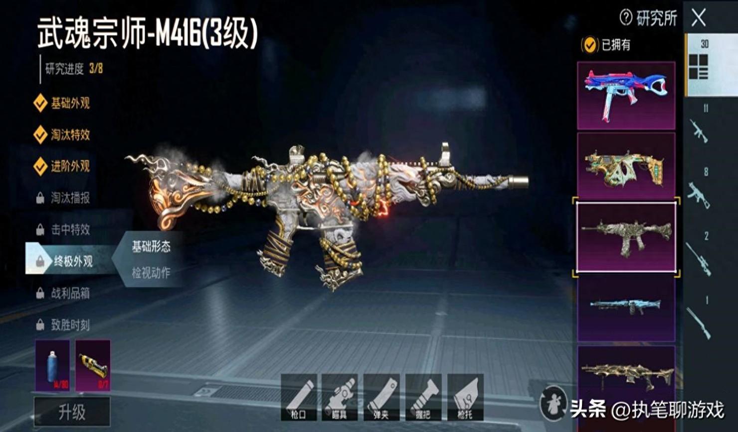 首先我們看到的是武魂宗師M416,它在天哥眼裏算得上是寫實風格,甚至還加入了一些酷炫的古武元素,金色項鍊纏繞在一起,再加上若隱若現的煙霧,宛如返璞歸真一樣的神祕感撲面而來。